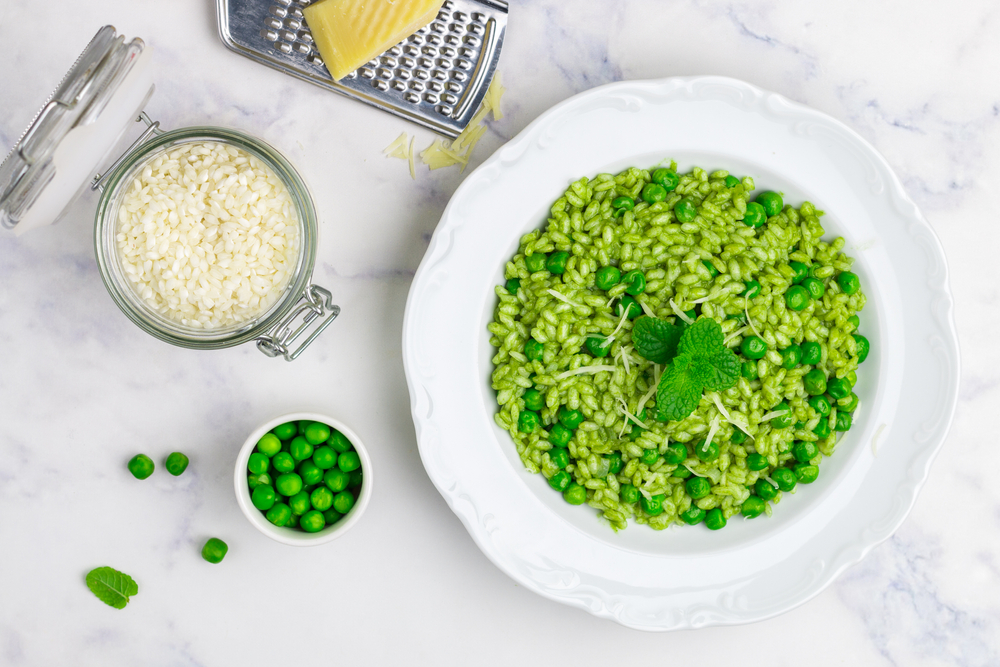 Ingredience: 300 g rýže arborio, 1 menší šalotka, 2 lžíce másla, 100 ml suchého bílého vína, asi 1 litr horkého zeleninového vývaru, 200 g hrášku, 50 g jemně nastrouhaného pecorina nebo parmazánu, hrst petrželky, několik lístků máty, sůl, čerstvě mletý pepř.