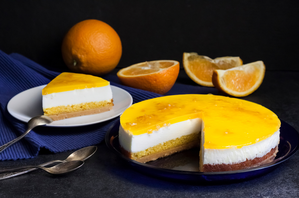 Vejce vyšlehejte s cukrem do pěny, opatrně vmíchejte mouku. Těsto vlijte do formy a pečte při 170 °C asi 25 minut. Po vychladnutí vyšlehejte smetanu, zvlášť promíchejte tvaroh s cukrem a vanilkou, obě hmoty spojte a rozetřete na korpus. Pomerančovou šťávu zahřejte, rozpusťte v ní želatinu a nechte mírně vychladnout. Nalijte na pěnu a dejte minimálně na 4 hodiny do lednice.