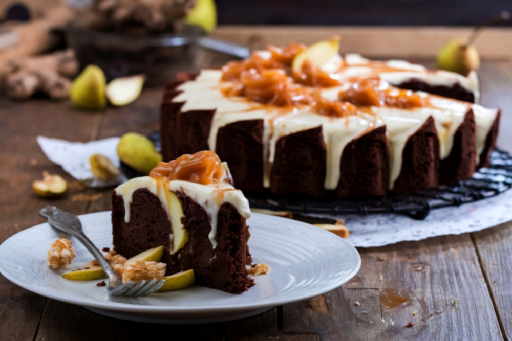 V míse smíchejte vejce s cukrem, přidejte olej a mléko. Vmíchejte mouku, kakao a prášek do pečiva. Hrušky oloupejte, nakrájejte na menší kousky a lehce je zapracujte do těsta. Těsto vlijte do dortové formy a pečte při 170 °C asi 45 minut. Po vychladnutí smíchejte krémový sýr s cukrem a smetanou a rozetřete na koláč. Cukr na karamel nechte na pánvi rozpustit do jantarové barvy, zalijte smetanou a krátce provařte. Vychladlý karamel nalijte na krém.