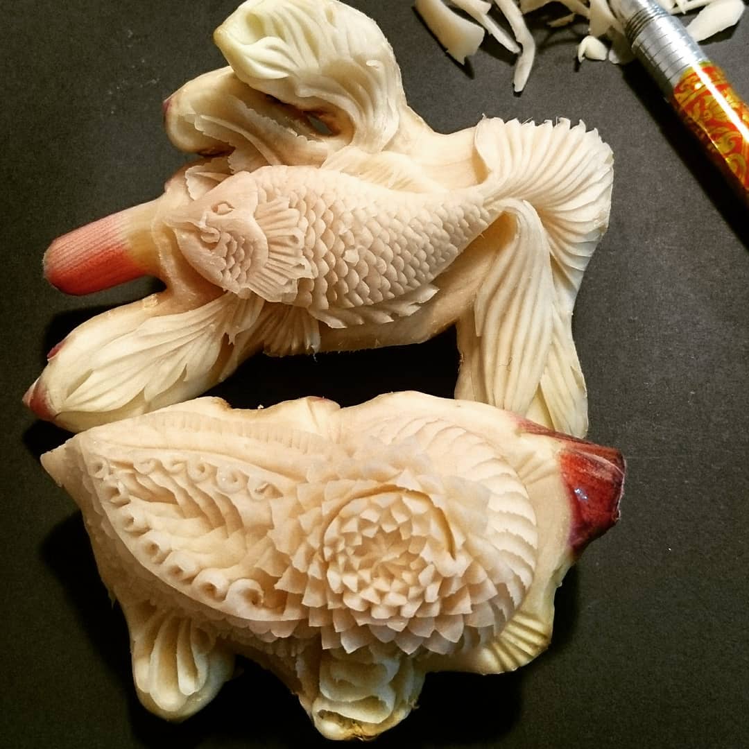 Kishimotova kariéra navíc dokládá, že carving nemusí být jen ozdoba talíře. Je to práce, která navrací pozornost k surovině, jejímu tvaru, tvrdosti, chuti i času, který má kuchař na její zpracování, než dojde k oxidaci. Jeho umění nespočívá pouze v řezbářství, ale také v rychlosti, aby nedošlo k oxidaci. „Pomocí ostrých ručních nožů kombinuje Kishimoto staletí staré umění thajského řezbářství ovoce s japonským uměním Mukimono, aby ozdobil jablka, mrkev, brokolici a fazole geometrickými vzory a propracovanými motivy,“ uvedl magazín This is Colosal.